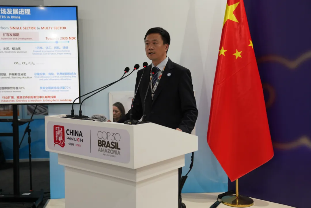 在国内外碳市场建设与合作持续推进的背景下,巴西时间11月11日上午,以“中国碳市场高质量发展与经验分享”为主题的边会在COP30中国角成功举办。边会围绕强制碳市场与自愿碳市场两大核心领域展开,汇聚了来自中国、巴西、欧盟、英国和新加坡等多个国家和国际组织的代表,共同探讨碳市场建设的实践经验、政策制度创新与高质量发展方向。